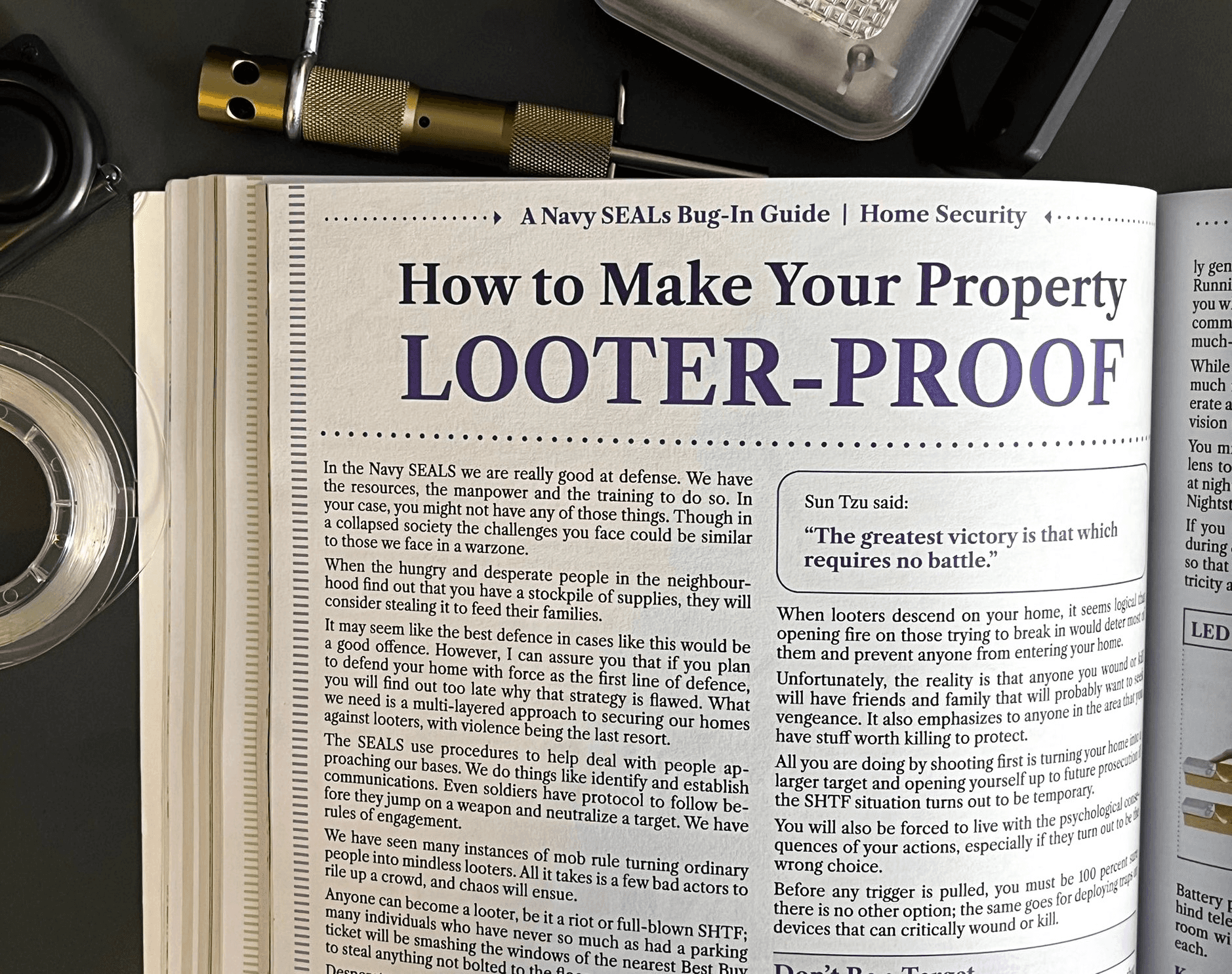 I’ll show you everything a SEAL knows about how to protect your home against looters and other intruders. If these ingenious tactics work against highly trained soldiers and terrorists, you can bet they’ll work against your average disorganized looter in a crisis.